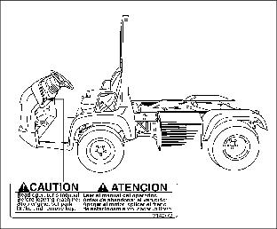 IntroductionProduct IdentificationSafetyUnderstanding The Machine Safety Labels WARNING: RIDERS CAN FALL OFF AND BE KILLED Emissions Control System Certification Label (NonRoad Diesel) Emission Control System Certification Label (Small Off-Road Gas Engines) Emission Compliance Period (Small Off-Road Gas Engines) Protect Children and Prevent Accidents Stay Clear Of Rotating Drivelines Driving Safely on Public Roads Handling Waste Product and Chemicals Using the Lift Cylinder Safety Support OperatingReplacement PartsService IntervalsService EngineService TransmissionService - HydraulicsService Steering & BrakesService ElectricalService MiscellaneousTroubleshootingStorageAssemblySpecificationsWarrantyJohn Deere Quality StatementService Record