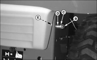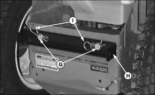 Preparing VehicleBallasting RequirementsFor front end ballast on SST Tractorsˇ mid-mount mower and one suitcase weight must be installed when using the tractor trunk. For front end ballast on all other tractorsˇ two front suitcase weights or two front wheel weights must be installed when using the tractor trunk. Using Your Tractor Trunk for Rear BallastUse the following recommendations to determine proper ballast for your machine:Installing Mounting Bolts (LT Lawn Tractors)NOTE: Bolt assembly can be found in bag of parts. Wheels can be removed for easier installation. 1. Locate the upper hole (A) on both sides at rear of tractor frame. 2. Install M10x40 bolt (B), flat washer (C) and spacer (D) from the outside and secure with M10 nut (E) on inside of tractor frame. Install on both sides of frame. Installing Anchor to Tractor Frame (STX's, LX277-AWS, 325, 345, and GT Series Tractors Only)Parts In Tractor Trunk Mounting Kit (BM19211) Include:On STX Models:1. Lift seat and unfasten the battery rubber strap. 2. Install the flat anchor stabilizer (A) from the rear of the tractor up through the seat battery hole and place the support behind the tractor frame. 3. Align the small holes and fasten the welded anchor (B) to the flat support (A) using two 5/16x1.00 in. bolts (C) and two 5/16 in. flange nuts (D). Do not tighten at this time. ˇ Nuts are tightened after installing the support frame. 4. Fasten battery rubber strap and lower seat. On LX277-AWS Model:1. Install two 5/16x1.00 in. bolts from inside tractor frame and install two flat washers (D). 2. Install welded anchor (E) and two 5/16 in. flange nuts (F). Do not tighten at this time. Tighten nuts installing the support frame. On 325, 345, and GT Models1. Install two 3/4x3/4 in. drilled pins (G) from inside tractor frame into large holes. 2. Attach welded anchor (H) with two spring locking pins (I). |