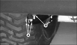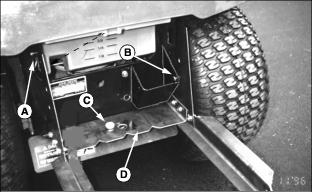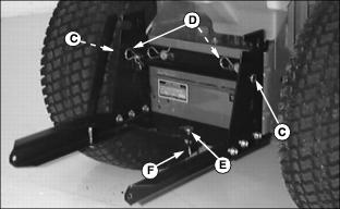 Installing to LX Lawn Tractors Without Bagger Attachment and 325, 345, and GT Series Lawn and Garden TractorsInstalling Support Frame to TractorPicture Note: Model 325 shown. 1. Install support frame to tractor with two 3/8x3/4 in. drilled pins (C) and two large spring locking pins (D), and one 3/4x29/32 in. drilled pin and spring locking pin (E) in center drawbar support (F). 2. Level each side of support frame. Adjust support rails to same height. Installing Trunk on Support Frame1. Place trunk assembly onto support frame. 2. Install two 3/8x3/4 in. drilled pins, flat washers, and small spring locking pins (A), one on each side. |