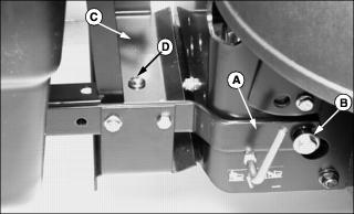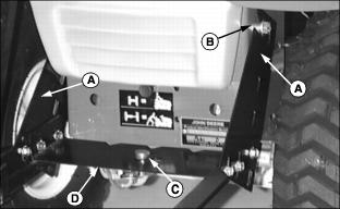 Installing to LX Lawn Tractors With Bagger AttachmentInstalling Support Frame to TractorNOTE: Support frame must be assembled correctly for attachment to tractor. See ASSEMBLY section for information. 1. Install support frame to tractor frame on left side with one 3/8x3/4 in. drilled pin (A) and one large spring locking pin. 2. On right side, install one 3/8x3/4 in. drilled pin through the bagger bracket (B) and support frame and secure with spring locking pin as shown. 3. Install 3/4x29/32 in. drilled pin and spring locking pin (C) in center drawbar support (D). 4. Level each side of support frame. Adjust support rails to same height. Installing Trunk on Support Frame1. Place trunk assembly onto the support frame. 2. Install two 3/8x3/4 in. drilled pins, flat washers, and small spring locking pins (A), one on each side.