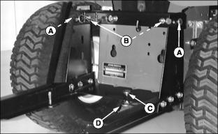Installing to LT Lawn TractorsInstalling Support Frame to Tractor1. Install support frame (A) to mounting bolts (B). 2. Install 3/4x29/32-in. drilled pin and spring locking pin (C) in center drawbar support (D). 3. Level each side of support frame. Adjust support rails to same height. Installing Trunk on Support Frame1. Place trunk assembly onto support frame. 2. Install two 3/8x3/4-in. drilled pins, flat washers, and small spring locking pins (A), one on each side.