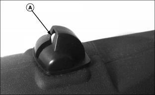 OperatingAir Flow for Material Collection SystemThe material collection system needs strong air flow from mower deck to bags for best performance. The Rear Bagger and Power Flow chutes are equipped with a flow indicator that shows whether sufficient air flow is moving through the system: ˇ When red indicator (A) is visible, little or no air flow is moving through the chute. ˇ When red indicator (A) is not visible, sufficient air flow is present. Follow these suggestions to maintain sufficient air flow:ˇ Keep blower assembly (if equipped), chutes, hopper top, screen, bags, and underside of mower deck clean. ˇ Keep throttle lever at fast position but travel slow. ˇ Level mower front-to-rear so rear of mower is no more than 10 mm (3/8 in.) higher than front of mower. ˇ Operate mower in higher cutting positions. ˇ Replace worn or damaged mower blades. ˇ Attach optional lips (if available). Check for Plugging While BaggingCheck the flow indicator on the Rear Bagger or Power Flow chute periodically for any indication of loss of air flow. If there is a trail of clippings behind mower or the clippings blow to the side, check for plugged chute, full bags, or problems with the blower assembly (if equipped). If grass builds up in front of mower deck discharge chute, check for plugged rear bagger or power flow chute, or problems with the blower assembly (if equipped). Dismounting to Inspect or Unplug Material Collection System