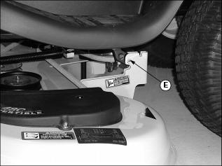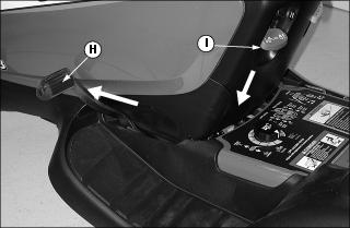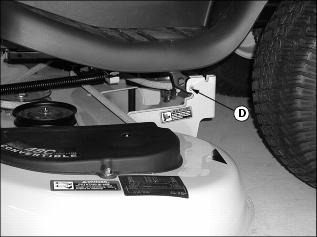 9. Raise mower lift arms to transport position: a. Pull back and hold attachment lift pedal (H). b. Push attachment lift lever (I) down to unlock. c. Hold lift pedal securely and slowly move it to the down position. 10. Slide mower deck out from under the tractor. Installing Mower1. Park machine safely. (See Parking Machine Safely in the Safety Section.) 2. Raise mower lift arms to transport position: a. Pull back and hold attachment lift pedal (A). Picture Note: When the lift pedal is down, the mower lift arms are in the up position. b. Push attachment lift lever (B) down to unlock. c. Move lift pedal (A) slowly forward. 3. Adjust mower cutting height to the lowest position. 4. Move mower drive sheave (C) inward to tighten mower belt. 5. Slide mower deck under the tractor and line up mower deck lift brackets, one on each side, with lift arms.