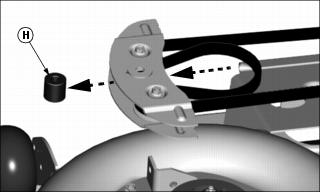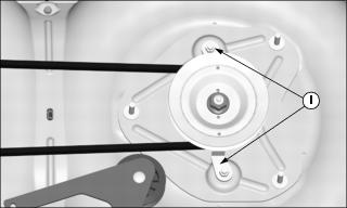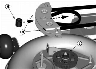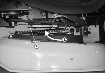 12. Put open end (K) of bracket on bottom of tractor drive sheave. NOTE: To ease spring tension, a gripping device may be used, such as an adjustable open-end wrench, to hold the end of tensioning lever (L) when tightening belt. 13. Push tensioning bracket lever (L) in to tighten belt. 16. Adjust mower wheels for desired cutting height. Replacing Primary Mower Drive Belt1. Park machine safely. (See Parking Safely in the Safety Section). 2. Put mower deck in the lowest position.