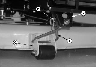 a. Hold attachment lift pedal (A) securely and pull it back as far as it will go and hold. b. Lift up on attachment lift lever (B) and lock lift arms in mowing (down) position. Picture Note: Put drilled pin head (D) to the outside as shown. 48C used for photo purposes. 7. Put head of drilled pin (D) to the outside as shown and install lift arms to mower lift brackets. Secure with spring locking pin to the inside. 8. Slide front draft rod (E) into hole in bracket (F) in front of tractor and onto deck bracket (G). 9. Fasten with drilled pin and spring locking pin (H). 10. Put drive belt around mower sheave (C) and engine drive sheave (I) and move mower sheave back to tighten drive belt. Picture Note: Mower deck shown removed from tractor for clarity. 11. Put hole end of drive belt tensioning bracket (J) over top bolt of mower sheave. Tensioning bracket should be in the open position as shown.