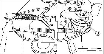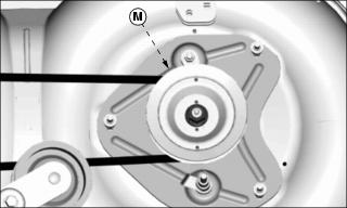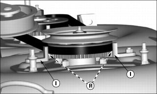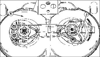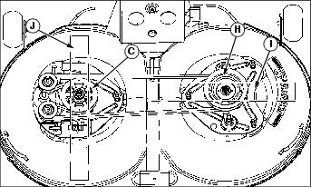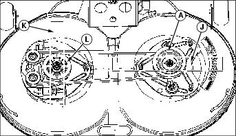 8. Loosen jam nut (D) and adjusting nut (E) so that there is a small gap between washer (F) and spring bushing (G). 9. Rotate adjusting nut (E) clockwise until the washer (F) makes solid contact with the surface of the spring bushing (G). 10. Tighten idler assembly center nut (B) to 73 N·m (54 lb-ft). 11. Tighten jam nut (D) against adjusting nut (E) to 27 N·m (20 lb-ft). 12. Turn left spindle sprocket in clockwise direction to be sure belt is seated properly in the sprockets and idlers. NOTE: The position of the drain holes in the spindle sheave (H) and the indentations in the timing sprocket (C) are in alignment with the mower blades (I) and (J). 13. Check that blades are timed (90° from each other). 14. Install top washer on top of center nut (B) and close left spindle cover. 15. Fasten cover with lock nut and tighten to 14 N·m (10 lb-ft). Replacing Mower Deck Secondary Belt and Timing Belt (Freedom42)1. Park machine safely. (See Parking Safely in the Safety Section.) 2. Remove mower deck from tractor. 3. Check blade bolt torque. Carefully hold blade with glove, use a hand torque wrench, and tighten bolt to 62 N·m (46 lb-ft). 4. Disconnect idler spring (A). 5. Remove secondary belt (B) from right spindle sheave. 6. Remove five nuts (C) and remove cover. 7. Turn jam nut (D) and adjusting nut (E) counterclockwise to end of threaded rod, and remove tensioning spring assembly. 8. Remove center nut and washer (F) and remove fixed idler assembly (G) from left support plate. Do not loosen other idler assembly hardware that retains idlers. 9. Remove spacer (H) located between fixed idler assembly plates and remove idler assembly from belt. 10. Loosen two belt guides (I) and rotate away from left sprocket. 11. Remove damaged timing belt. 12. Clean top surface of mower deck and sheaves. NOTE: The position of the drain holes in the spindle sheave (A) and the indentations in the timing sprocket (L) are in alignment with the mower blades (J) and (K). 13. Position mower blades (J) and (K) 90° from each other. 14. Install new mower deck timing belt. a. Route belt around right spindle sprocket (M) located under the mower drive belt sheave. b. Route belt around outside of idlers and then in between left fixed idlers (N) pulling a belt loop through the idler assembly. c. Insert spacer (H) between fixed idler plates and idlers. d. Install the fixed idler assembly on the stud of the left support plate. e. Wrap belt loop around left spindle sprocket (L). 15. Install washer and center nut (F) on fixed idler assembly. Leave nut one turn loose at this time. 16. Check that blades (J) and (K) are still timed (90° from each other).