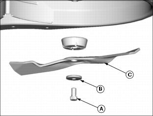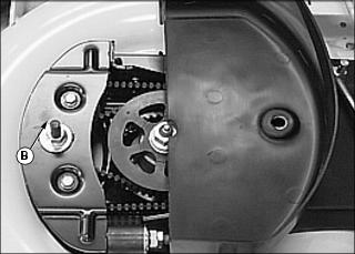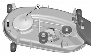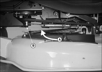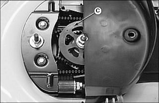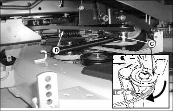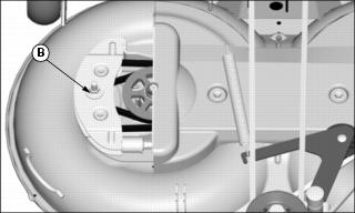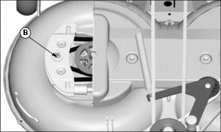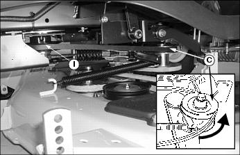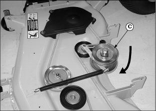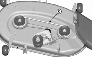 1. Park machine safely. (See Parking Safely in the Safety Section.) 2. Put mower deck in the lowest position. Picture Note: Mower deck removed for photo clarity only. The belt tensioning spring assembly can be accessed without removing the mower deck or the timing belt cover. 3. Remove lock nut (A) and open left spindle cover. 4. Check timing belt for damage. If the belt is damaged, replace the timing belt. 5. Remove top washer and loosen idler assembly center nut (B) one full turn. Do not remove nut. Picture Note: Underside of deck shown for illustration only. 6. Check that blades are timed (90° from each other). 7. Turn left spindle sprocket (C) in clockwise direction to be sure belt is seated properly in the sprockets and idlers.