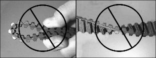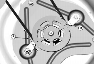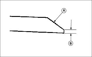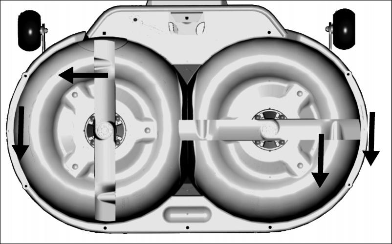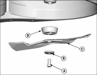 a. Hold a 1 mm (0.039 in.) shim/gage between belt guides and sprocket rim, location (R), and rotate belt guides (I) clockwise against gage. b. Tighten belt guide nuts to 24 N·m (18 lb-ft). Picture Note: Right spindle sheave removed for photo clarity only. c. Remove gage and inspect belt guide-to-sprocket rim clearance (R) while rotating spindle in the clockwise direction. Clearance (R), one on each side, should be 1 0.5 mm (0.039 0.020 in.). Belt should not contact belt guide. 20. Install timing belt cover. 21. Install secondary belt (B) on right spindle as shown. Replacing Mower Deck (Secondary) Belt (48C)1. Park machine safely. (See Parking Safely in the Safety Section.) 3. Remove two belt shields (A). 4. Disconnect idler spring (B). 6. Inspect belt for wear or damage; replace as necessary. 7. Clean top surface of mower deck and sheaves. 8. Install belt on mower deck as shown. 9. Connect idler spring to idler arm. Checking for Bent Mower Blades1. Park machine safely. (See Parking Safely in the Safety Section.) 2. Lower mower deck to mowing position. Picture Note: Mower deck with side discharge used for illustration. 3. Measure distance (A) between blade tip and flat ground surface. 4. Turn blade. Measure distance between other blade tip and flat ground surface. 5. Install new blade if the difference between the two measurements is more than 3 mm (1/8 in.). Servicing Mower Blades (42 All Purpose and 48C)Removing Mower Blades1. Raise mower deck to gain access to mower blades. If necessary, remove mower deck. 2. Block mower blade with a piece of wood to prevent it from spinning. 3. Loosen and remove bolt (A), washer (B) and blade (C). 4. Inspect blades; sharpen, balance or replace blades as necessary. Installing Mower Blades1. Make sure deflector cups (D) are in place between spindle and blade. 2. Position mower blades (C) with the cutting edge towards the ground onto the mower spindle. 3. Install blade washer (B) with cup side toward the blade. 4. Install and tighten bolt (A) by hand until mower blade is in full contact (fully seated) with spindle. 5. Block mower blade with a piece of wood to prevent spinning and tighten bolts to: · 42 All Purpose Mower Deck: 75 N·m (55 lb-ft). · 48C Mower Deck: 68 N·m (50 lb-ft). Servicing Mower Blades (Freedom42)Removing Mower Blades1. Hold mower blade with glove to prevent mower blades from spinning. 2. Raise mower deck to gain access to mower blades. If necessary, remove mower deck. 3. Loosen and remove bolt with washer (A), and blade (B). 4. Inspect blades; sharpen, balance or replace blades as necessary. Installing Mower Blades1. Check mower to be sure you are installing the blades on the correct side. · There are direction arrows located on each outside edge of the mower. There is a right and a left side blade. The blades are marked for identification. 2. Position mower blades (B) with the cutting edge towards the ground onto the mower spindle and align key on bottom of spindle with slot in blade. 3. Install and hand tighten bolt with washer (A) until mower blade is in full contact (fully seated) with spindle. 4. Hold mower blade with glove to prevent spinning, tighten bolts to 62 N·m (46 lb-ft). 5. Check mower deck timing and adjust if necessary. Sharpening Blades· Sharpen blades with grinder, hand file, or electric blade sharpener. · Keep original bevel (A) when grinding. · Blade should have 0.40 mm (1/64 in.) cutting edge (B) or less. · Balance blades before installing. Balancing Blades2. Put blade on nail in a vise. Turn blade to horizontal position. 3. Check balance. If blade is not balanced, heavy end of blade will drop. |