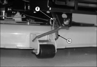 NOTE: To ease spring tension, a gripping device may be used, such as an adjustable open-end wrench, to hold the end of tensioning lever (B) when releasing belt tension. 4. Hold belt tensioning lever (B) securely and slowly pull it all the way out toward you as far as it will go to release belt tension. Picture Note: Mower deck shown removed from tractor for illustration. 5. Slide belt tensioning bracket forward, lift off mower sheave (C) and remove bracket. 6. Hold mower sheave (C) securely and slowly move it toward front of tractor to release tension and remove drive belt (D). 7. Check that mower lift lever is locked, remove spring locking pin and drilled pin (E) and disconnect lift arms, one on each side. 8. Remove spring locking pin and drilled pin (F) and remove front draft rod (G).
