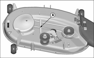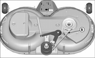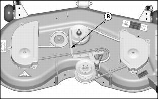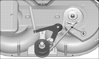 4. Remove open end of the tensioning bracket (B) from the engine drive sheave and set on top of mower deck. 5. Hold mower sheave securely and move it toward the front of the tractor to loosen belt and remove mower drive belt (C) from engine drive sheave and mower sheave. 6. Inspect belt for wear or damage; replace as necessary. 7. Place belt around mower sheave and engine sheave. 8. Push the mower sheave to the rear of the tractor and tighten belt. Picture Note: 48C mower deck used for photo purposes. 9. Put open end of tensioning bracket (B) on to the lower part of drive sheave. NOTE: To ease spring tension, a gripping device may be used, such as an adjustable open-end wrench, to hold the end of tensioning lever (A) when tightening belt. 10. Push belt tensioning lever (A) in to tighten belt. Replacing Mower Deck (Secondary) Belt (42 All Purpose)1. Park machine safely. (See Parking Safely in the Safety Section.) 4. Disconnect idler spring (B). 6. Inspect belt for wear or damage; replace as necessary. 7. Clean top surface of mower deck and sheaves. 8. Install belt on mower deck as shown. 9. Connect idler spring to idler arm. Adjusting Mower Deck Timing Belt Tension (Freedom42)