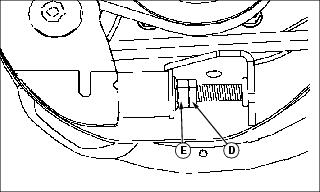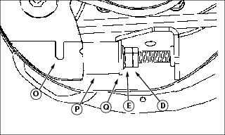 17. Install tensioning spring assembly and adjust timing belt tension. a. Align notch (O) in idler assembly with tab on spring bushing (P). b. Rotate adjusting nut (E) clockwise until the washer (Q) makes solid contact with the surface of the spring bushing (P). c. Turn adjusting nut an additional 1/2 turn to allow for new belt stretch. Do not over tighten. d. Turn right spindle sheave several rotations clockwise and observe that belt is riding properly in sprockets and idlers. e. Tighten jam nut (D) against adjusting nut. 18. Tighten center nut (F) to 73 N·m (54 lb-ft).