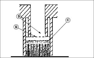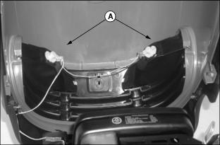 2. Check electrolyte level. Electrolyte level (B) should be 6 mm (1/4 in.) above plates (C) and below filler neck (D). 3. Add distilled water if necessary. 5. Check battery cable hardware and tighten if necessary. Removing and Installing the Battery