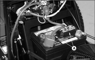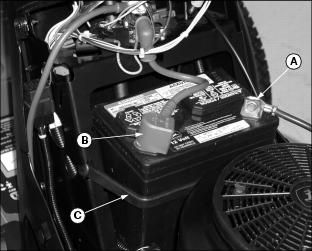 Removing:1. Park machine safely and lift hood. (See Parking Safely in the Safety Section.) 2. Disconnect negative (-) battery cable (A). 3. Push red cover (B) away from positive (+) battery cable and remove cable from battery. 4. Remove black rubber strap (C). Installing:1. Place battery on battery tray. 2. Connect positive (+) cable to battery first, then negative (-) cable. 3. Apply general purpose grease or silicone spray to terminal to help prevent corrosion. 4. Slide red cover over positive battery cable. 5. Install black rubber strap. Cleaning Battery and Terminals