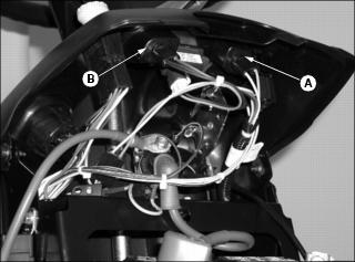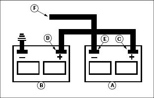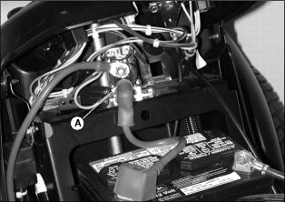 1. Disconnect and remove battery. 2. Wash battery with solution of four tablespoons of baking soda to one gallon of water. Be careful not to get the soda solution into the cells. 3. Rinse the battery with plain water and dry. 4. Clean terminals and battery cable ends with wire brush until bright. 5. Apply petroleum jelly or silicone spray to terminal to prevent corrosion. Using Booster Battery1. Connect positive (+) booster cable to booster battery (A) positive (+) post (C). 2. Connect the other end of positive (+) booster cable to the disabled vehicle battery (B) positive (+) post (D). 3. Connect negative (-) booster cable to booster battery negative (-) post (E). 4. Connect the other end (F) of negative (-) booster cable to a metal part of the disabled machine frame away from battery. 5. Start the engine of the disabled machine and run machine for several minutes. 6. Carefully disconnect the booster cables in the exact reverse order: negative cable first and then the positive cable. Replacing Fuse1. Pull defective starter fuse (A) out of socket. 2. Check metal clip in fuse window and discard fuse if clip is broken. 3. Push new 15 Amp fuse into socket. Replacing Indicator Light Bulbs (SST18)NOTE: If more than one bulb is defective, replace only one bulb at a time. Make sure light socket is installed in correct holder. 1. Turn indicator bulb socket 1/8 turn counterclockwise to remove it. · Oil Pressure Indicator Light (A). · Battery Discharge Light (B). 3. Push new bulb into socket and install socket into holder. Replacing Headlight Bulbs1. Push in and turn bulb socket (A) 1/4 turn counterclockwise to remove. 2. Replace defective bulb with a new bulb. 3. Insert bulb socket into housing, push in and turn 1/4 turn clockwise to install. |