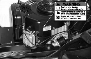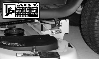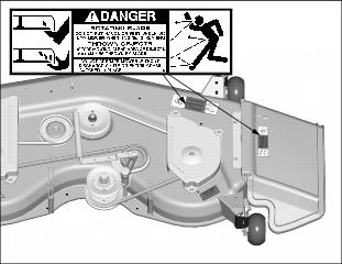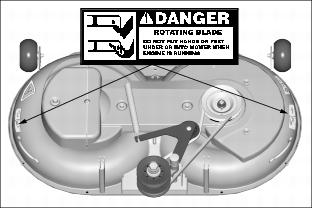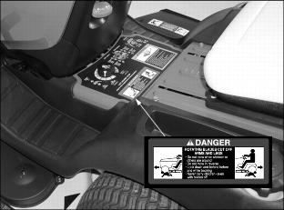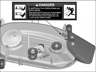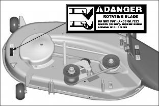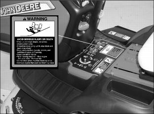 SafetyUnderstanding The Machine Safety LabelsThe machine safety labels shown in this section are placed in important areas on your machine to draw attention to potential safety hazards. On your machine safety labels, the words DANGER, WARNING, and CAUTION are used with this safety-alert symbol,. DANGER identifies the most serious hazards. The operator's manual also explains any potential safety hazards whenever necessary in special safety messages that are identified with the word, CAUTION, and the safety-alert symbol,. DANGER: ROTATING BLADES CUT OFF ARMS AND LEGS· Do not mow when children or others are around · Look down and behind before and while backing · Never carry children - even with blades off WARNING: AVOID SERIOUS INJURY OR DEATH· Drive up and down slopes, not across · If machine stops going uphill, stop blade and back down slowly · Keep safety devices (guards, shields, and switches) in place and working · Do not drive where machine could slip or tip · Remove objects that could be thrown by blade WARNING: LOADED SPRINGPicture Note: Two decals, one on each mower deck lift bracket. 48C used for photo purposes. · To avoid injury from loaded spring, read operator's manual before changing attachments. DANGER - CAUTION: POISONPicture Note: Located on Battery · Shield eyes, explosive gases can cause blindness or injury. · Sulfuric acid can cause blindness or severe burns. · Flush eyes immediately with water. Get medical help fast. · Keep out of reach of children. · Keep vent caps tight and level. WARNINGPicture Note: Label is located on engine. · Read and follow Operating Instructions before running engine. · Gasoline is flammable. Allow engine to cool at least 2 minutes before refueling. · Engines emit carbon monoxide, DO NOT run in enclosed area. DANGER: ROTATING BLADEDANGER: ROTATING BLADE - THROWN OBJECTSPicture Note: On 42 All Purpose: One decal on mower deck discharge chute. Picture Note: On 48C: Two decals, one on discharge chute and one on right side of mower deck. · Do not put hands or feet under or into mower when engine is running. · Before mowing, clear area of objects that may be thrown by blade. · Do not operate mower without discharge chute or entire grass catcher in place. DANGERPicture Note: On 42 All Purpose: One decal on right side of mower deck. · To avoid injury from rotating blades and thrown objects: · Keep hands and feet away from rotating blades. · Keep bystanders a safe distance away. · Do not operate mower without discharge chute or entire grass catcher in place. Emission Control System Certification LabelNOTE: Tampering with emission controls and components by unauthorized personnel may result in severe fines or penalties. Emission controls and components can only be adjusted by EPA and/or CARB authorized service centers. Contact your John Deere Commercial and Consumer Equipment Retailer concerning emission controls and component questions. The presence of an emissions label signifies that the engine has been certified with the United States Environmental Protection Agency (EPA) and/or California Air Resources Board (CARB). The emissions warranty applies only to those engines marketed by John Deere that have been certified by the EPA and/or CARB; and used in the United States and Canada in off-road mobile equipment. Emission Compliance PeriodIf your engine has the emission compliance category listed on the emission control system certification or air index label, this indicates the number of operating hours for which the engine has been certified to meet EPA and/or CARB emission requirements. The following table provides the engine compliance period in hours associated with the category found on the certification label. CertificationYour mower has been certified by an independent laboratory for compliance with American National Standard B-71.1, "Safety Specifications" for Power Lawn Mowers, Lawn and Garden Tractors, and Lawn Tractors. Operating Safely· Read, understand and follow all instructions in the manual and on the machine before starting. In addition to reading your Operator's Manual, view your Mowing Safety Tips Video. · Practice operating the Spin-Steer in a large open area with the blades off. Keep practicing until you feel confident in your maneuvering and driving skills. · Only allow responsible adults, who have practiced driving and are familiar with the instructions to operate the machine. · Inspect machine before you operate. Be sure hardware is tight. Repair or replace damaged, badly worn, or missing parts. Be sure guards and shields are in good condition and fastened in place. Make any necessary adjustments before you operate. · Check brake action before you operate. Adjust or service brakes as necessary. · Stop machine if anyone enters the area. · If you hit an object, stop the machine and inspect it. Make repairs before you operate. Keep machine and attachments properly maintained and in good working order. · Be aware of the mower discharge direction and make sure that no one is in the path of the discharge direction. · Do not leave machine unattended when it is running. · Only operate during daylight or with good artificial light. · Be careful of traffic when operating near or crossing roadways. · Do not wear radio or music headphones while operating the machine. Safe operation requires your full attention. · Older adults are involved in a large percentage of riding mower accidents involving injury. These operators should evaluate their ability to operate a mower safely enough to protect the operator and others from serious injury. Avoid Tipping· Slopes are a major factor related to loss-of-control and tip-over accidents, which can result in severe injury or death. Because this tractor operates so differently we absolutely do not recommend mowing on slopes greater than a ten-degree gradual rise. · Do not drive where machine could slip or tip. · Keep away from drop-offs, steep slopes, ditches and 