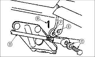 Service SteeringAdjusting the Steering (Model GX325)The amount of steering response and effort on GX325 models can be adjusted to the operator's preference. 1. Park machine safely. (See Parking Safely in the SAFETY section.) 2. Locate steering linkage (A) under left side footrest. 4. Remove capscrew and washer (C). 5. Move rod (D) to desired hole: · Top Hole (E) - Steering will require less effort but response will be slower as it will take more rotations of the steering wheel to turn the machine. Use this hole position when heavy loads are applied to front of machine such as a snowthrower. · Lower Hole (F) - Steering will require more effort but response will be faster as it will take fewer rotations of the steering wheel to turn the machine. Use this hole position when using light duty attachments such as a mower. |