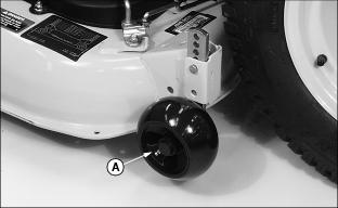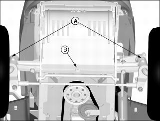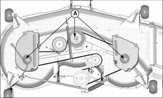 Service LubricationGreaseThe following greases are preferred:· John Deere Multi-Purpose SD Polyurea Grease · John Deere Multi-Purpose HD Lithium Complex Grease · John Deere Moly High Temperature EP Grease If not using any of the preferred greases, be sure to use a general all-purpose grease with an NLGI grade No.2 rating. Wet or high speed conditions may require use of a special-use grease. Contact your Servicing dealer for information. Lubricating Front Axle and Axle Pivot1. Raise front of machine with a safe lifting device so front wheels are slightly off the ground. 2. Lubricate front spindles (A) and axle pivot (B) with recommended grease. 3. Turn steering wheel back and forth to distribute grease in spindles. 4. Lower machine to the ground. Lubricating Blade SpindlesLubricate three spindles (A) with recommended grease. Lubricating Mower WheelsLubricate mower wheel grease fittings (A). |