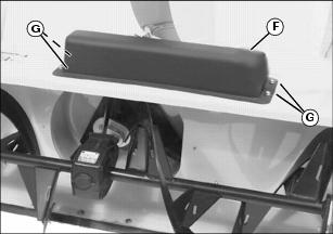 5. Install cable shield (F) and angle bracket and fasten with four hex head bolts (G) and lock nuts.
