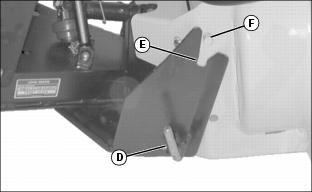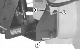 5. Move machine forward slowly until slot (E) on front hitch bracket lines up with pin (F) on attachment.