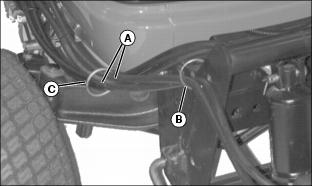 3. Route hydraulic chute hoses (A) through ring (B) on hitch bracket, through hose bracket (C) and then connect to hydraulic outlet on machine.