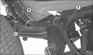 5. Route hydraulic lift hoses (D) on the inside of hitch bracket (E) and then through hose bracket (C) as shown by arrows, to eliminate pinching of hoses when lifting attachment.