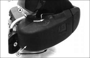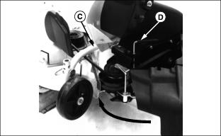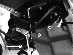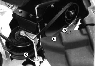 1. Put new belt around sheaves. If idler retainer brackets (B) were bent when removing, bend brackets to original position to keep belt on sheaves. Slide retainer (A) on blower access plate towards sheave to lock. 2. Put belt under rear support tube (C) and cross belt as shown. Put belt on double sheave. Close plastic belt shield. |
