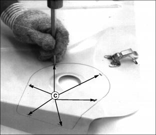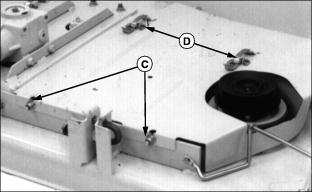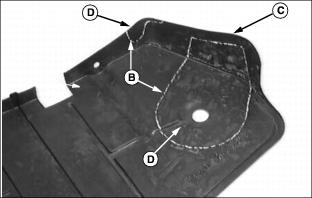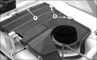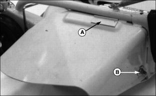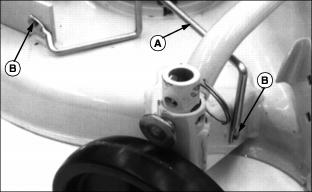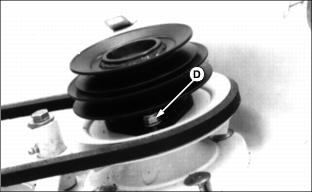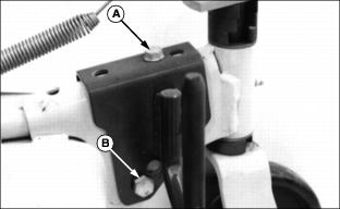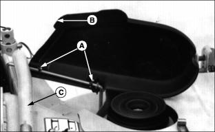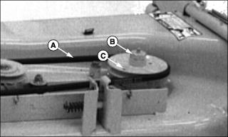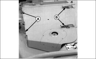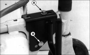 Preparing VehiclePreparing MowerNOTE: 420 and 430 Tractors-AM118915 Template Kit, ordered separately, is used to PREPARE MOWER. Complete the installation using this manual. Remove Shield And Sheave Knockout - Model 425, 445, And 455 Lawn Tractors (Metal Shield)NOTE: Older model mowers have yellow metal shields. Newer models have black plastic shields. Refer to proper instructions for your mower model. 1. Put your mower in lowest position. You DO NOT have to remove mower from the tractor to install this POWER FLOW attachment. Mower removed for photo clarity ONLY. 2. Use 15 mm wrench to remove two M10 nuts (A). Open latches (B) to remove right mower shield. 3. Put shield on hard surface. Use a chisel or punch to separate knockouts at six points (C). NOTE: Use screwdriver with large blade end in slots when removing insert to prevent shield from distorting. 4. Put large screwdriver, with large blade end, in slots to work panel back and forth to remove panel. Remove Shield And Sheave Cut-Out - Model 425, 445 and 455 Lawn Tractors (Plastic Shield)NOTE: Older model mowers have yellow metal shields. Newer models have black plastic shields. Refer to proper instructions for your mower model. 1. Put your mower in lowest position. You DO NOT have to remove mower from tractor to install this POWER FLOW attachment. Mower removed for photo clarity ONLY. 2. Use 15 mm socket wrench to remove one M10 nut (A) and large washer. Remove right shield. NOTE: Scribed lines are whitened in the photo for visual aid. 3. On the underside of the shield, locate cut-out areas marked with lines (B) scribed in plastic material. 4. Cut carefully along scribed lines to remove indicated parts (D) of shield. Use tin snips or other appropriate cutting tool to cut out necessary plastic shield material. Install Double Sheave2. Remove spindle locknut (B) to remove and discard sheave (C). Replace with new sheave from kit and install locknut. 4. Install double sheave with two M8x25 bolts and flange nuts (D). Flange of double sheave MUST seat against single sheave. Nuts are on top of double sheave flange. Install Belt Shield Support And Mower ShieldNOTE: Right-rear gauge wheel is turned for easier installation of support (A). 1. Install belt shield support (A) to deck with two M6x20 cap screws (B) and nuts. ˇ For Mower models with metal shield: Install shield on deck with nut(s) (C). Lock latch(es) (D). ˇ For Mower models with plastic shield: Slide front of shield under two clips (E) on deck. Slide left side of shield against center bracket. Center tab (F) should be above bracket edge and front and rear tabs should be under bracket edge. Install washer and M10 nut (G) removed when shield was removed. Use 15 mm socket wrench to tighten nut. Install Plastic Belt ShieldNOTE: Shield for 60-Inch Mower on 425, 445, and 455 Tractor shown in photo. 1. Fasten plastic belt shield to support with tie straps (A). Cut off ends of tie straps. Tab (B) on shield will snap under deck support tube (C) when closed. Adjust Gauge Wheels1. Adjust rear gauge wheels to 12.5 mm (1/2 in.) lower than front caster wheel(s) and/or roller. (Example) If 38 mm (1.5 in.) cutting height is desired, front roller/caster is set at 25 mm (1 in.) and rear gauge wheels are set at 38 mm (1.5 in.). Mower will be level at 38 mm (1.5 in.) when POWER FLOW is attached. Install Side Mounting BracketPicture Note: On 420 and 430 Tractors Picture Note: On 425, 445 and 455 Tractors Fasten side mounting bracket to right front gauge wheel support bracket with M10x20 self-tapping bolt (A) and M12x25 cap screw and nut (B). Tighten M10 bolt to 11 N.m (8 lb-ft) and M12 cap screw to 87 N.m (62 lb-ft). Cut Discharge Chute Stop - 420 And 430 Tractors1. If discharge chute stop (A) protrudes over chute edge: ˇ Remove bolts and nuts (B) on each side of chute. Retain hardware for use if using mower with POWER FLOW removed. ˇ Cut off protruding stop even with chute.This will allow chute to pivot open enough to attach POWER FLOW. 2. Fasten discharge chute to mower with hinge hardware. DO NOT INSTALL BOLTS AND NUTS (B) ON SIDES OF CHUTE. Discharge chute must lift up to install POWER FLOW. |