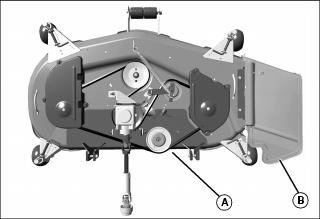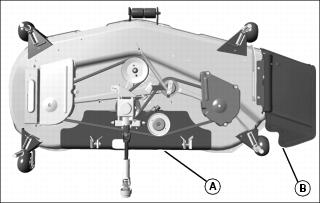 2. Install mower discharge chute to mower deck with two bolts (A) and lock nuts (B).