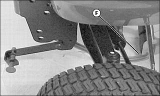 8. Pull out pin and pull down release latch (E) on front deck hanger bracket (F) to release deck. Rear of deck will slide off draft arms at this step.