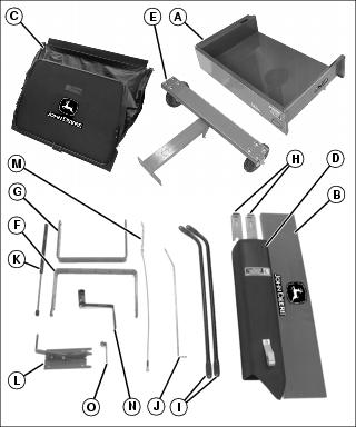 4. Put latches (I) in slots (H) on dump cart. Tighten all hardware.