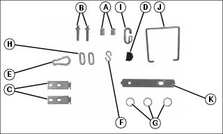 1. Attach slide plates (A) to outside of quik-tatch bracket (B) with 5/16x1-1/2 in. carriage bolt (C), 5/16 in. washer (D), spring (E), 5/16 washer (D) and 5/16 in. lock nut (F).