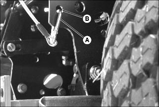 Unhook spring snap link (A) at end of cable assembly from hole in tractor hitch plate (B).