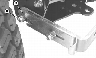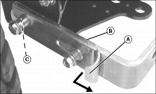 1. On both sides of Quik-Tatch hitch, grasp tab (A) and pull side plate (B) out and slide to rear to expose hook (C).