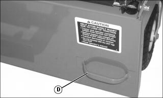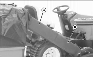 • Get off of tractor and pull dump cart latch (D) to fully dump load.