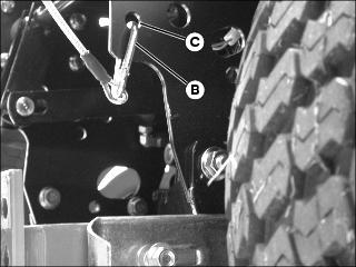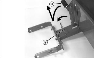 2. Unhook spring snap link (B) at end of cable assembly from hole in tractor hitch plate (C).