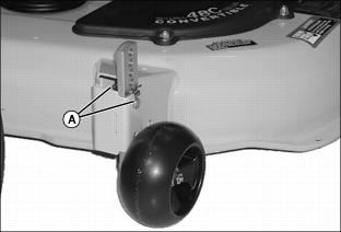2. Install three mower wheels in the mowing position and fasten to mower brackets with drilled pins and spring locking pins (A).