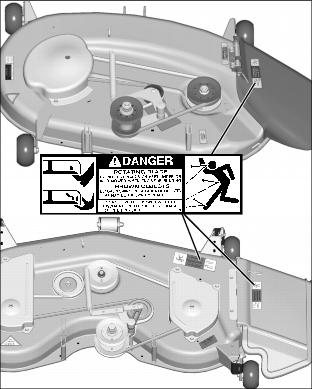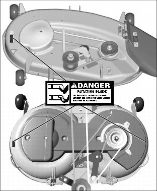 Picture Note: Top photo, 42C: One decal on discharge chute. Bottom photo, 48C: Two decals, one on discharge chute and one on right side of mower deck.