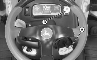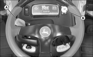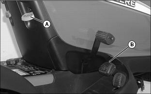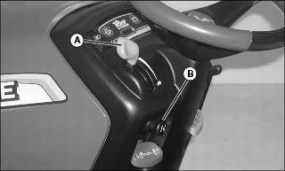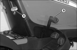 2. Pull lift lever (B) up to lock mower deck in the transport position.