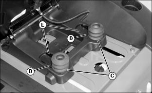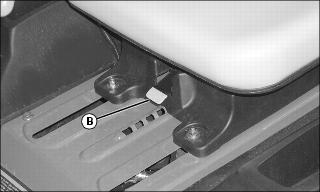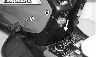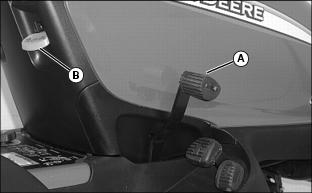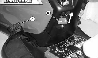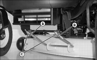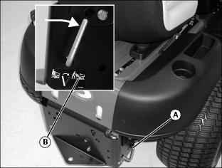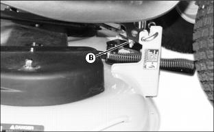 a. Turn nuts (B), one on each side, one turn counterclockwise to lower the mower deck.