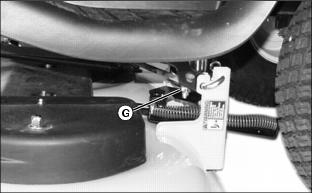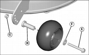 5. Check mower wheel position. Remove bolt (E), washer (F) and nut (G) on all wheels and move wheels with bushing (H) to proper hole.