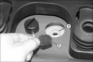 4. If oil level is low, slide operator's seat ahead and tip it forward to access reservoir (C). Clean area around reservoir cap. 6. Add HY-GARDŽ (J20D) oil until oil level is at full mark on reservoir. 8. Lower and adjust operator's seat. 10. Operate machine forward and in reverse several times. 11. Park machine safely. (See Parking Safely in Safety section.) 12. Wait at least three minutes for hydraulic oil to cool. 13. Check oil level again. Add oil if necessary. Changing Transmission Oil1. Park machine safely. (See Parking Safely in Safety section.) NOTE: Transmission is divided into two internally connected cavities. Rear drain plug (A) will drain differential gear side and front plug (B) will drain hydrostatic side. 3. Place drain pan under drain plugs (A) and (B). Remove plugs.