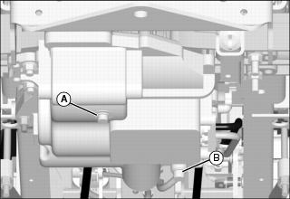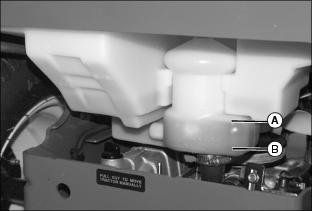3. Locate transmission oil reservoir at rear of machine. Reservoir is marked full (A) and add (B).