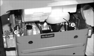 NOTE: Do not remove sealed black cap (C). Fill only at reservoir bottle. 4. Clean area around transmission fill cap on transmission oil reservoir (D). 5. Remove fill cap and reservoir filter to improve drainage. Allow to drain completely. 6. Install and tighten transmission drain plugs to 15 Nˇm (133 lb-in.). 7. Add approximately 4.4 L (4.6 qt) John Deere Low Viscosity HY-GARDŽ (J20D) to transmission reservoir (D) until oil level is at full mark. Install reservoir filter and cap. 9. Check for leaks around drain plugs and hydraulic filter. 10. Operate machine forward and in reverse several times. 11. Park machine safely. (See Parking Safely in Safety section.) 12. Wait at least three minutes for hydraulic oil to cool. 13. Check oil level in reservoir. Add oil to reservoir if necessary. Adjusting Cruise Control LeverNOTE: Cruise control lever is held in position by an adjustable friction mechanism pre-set at factory. Amount of friction can be adjusted to operator's preference or to accommodate normal wear. 1. Park machine safely. (See Parking Safely in Safety section.) Picture Note: Right wheel shown removed for clarity. Removal of wheel is not required. 2. Locate adjusting bolt (A) at right wheel well. 3. Turn adjusting bolt so cruise control lever moves easily forward and rearward while remaining stationary in any desired position: |