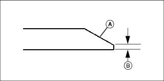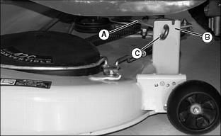 5. Lock lift lever in forward position. 6. Place lift arms (A) between mower lift brackets (B). 7. Release J-pin (C) to connect mower deck to lift arms. Repeat at other side. 8. Hook front lift rod assembly (D) into mower bracket. 9. Place front lift rod (E) into frame hooks so lever (F) is at left side of machine. Make sure rod is seated in frame hooks. 10. Push up lever (F) until tab (G) locks into hole in frame. 11. Remove drive belt tension rod (H) from bracket (I) and pivot rod as far as possible toward rear wheel to remove all belt tension. 12. Hold tension rod in released position. Install mower drive belt (J) onto engine drive sheave. 13. Pivot drive belt tension rod toward front of machine to tighten drive belt. Hook tension rod into bracket on mower. 14. 54C Mower Only - Rotate mower wheels to operating position. 15. Adjust lift assist spring if necessary. 16. Adjust mower level front-to-rear and side-to-side. 17. Adjust mower wheels for desired cutting height. Adjusting Lift Assist SpringNOTE: Weight of mower affects ease of lifting. Adjust lift assist spring for your particular mower deck model. 1. Make sure yellow indicator (A) is aligned with proper mark for mower deck model installed. If not, adjust lift assist spring so indicator is aligned with correct mower deck mark. 2. Turn adjusting bolt (B) at front of machine frame to adjust lift assist spring: · Clockwise - Increases spring tension and moves indicator toward front of machine for heavier mowers. · Counterclockwise - Decreases spring tension and moves indicator toward rear of machine for lighter mowers. Replacing Mower Drive (Primary) Belt1. Park machine safely. (See Parking Safely in Safety section.) 2. Lock mower deck in forward position. a. Grasp and hold tension rod (A) securely. b. Disengage rod from retaining bracket (B). c. Move rod as far as possible toward rear wheel to remove all belt tension. 4. Hold tension rod in released position. 5. Remove mower drive belt (C) from engine drive sheave and mower drive sheave. 6. Clean belt with a clean cloth. 7. Inspect belt for wear or damage. Replace as necessary. 8. Install belt on mower sheave and engine sheave. 9. Pivot drive belt tension rod toward front of machine to tighten drive belt. Hook tension rod into bracket on mower. Replacing Mower Deck (Secondary) Belt1. Park machine safely. (See Parking Safely in Safety section.) Picture Note: 42C shown above, 48C and 54C shown below. 4. Disconnect idler spring (B). 6. Clean upper mower deck and sheaves. 7. Inspect belt for wear and damage. Replace if necessary. 9. Connect idler spring (B). Make sure open end (D) of spring hook faces outward on idler arm. Checking for Bent Mower Blades1. Park machine safely. (See Parking Safely in Safety section.) 2. Lock lift lever in forward position. 3. Measure distance (A) between blade tip and flat ground surface. 4. Rotate blade 180° and measure other blade tip. 5. Install new blade if difference between two blade tip measurements is more than 3 mm (1/8 in.). Servicing Mower BladesRemoving Mower Blades1. Park machine safely. (See Parking Safely in Safety section.) 2. Raise or remove mower deck. 3. Block mower blade with a piece of wood to prevent it from spinning. 4. Loosen and remove bolt (A), washer (B), and blade (C). 5. Inspect blade condition. Sharpen, balance, or replace blades as necessary. Installing Mower Blades1. Make sure deflector cup (D) is seated properly between mower spindle and blade. 2. Position mower blade (C) with cutting edge toward ground onto mower spindle. 3. Install blade washer (B) with cup side toward blade. 4. Install and tighten bolt (A) by hand until mower blade is in full contact (fully seated) with spindle. 5. Block mower blade with a piece of wood to prevent spinning. · 42C Mower - 75 N·m (55 lb-ft). · 48C and 54C Mowers - 68 N·m (50 lb-ft). Sharpening Blades· Sharpen blades with grinder, hand file, or electric blade sharpener. · Keep original bevel (A) when grinding. · Blade should have 0.40 mm (1/64 in.) cutting edge (B) or less. · Balance blades before installing. Balancing Blades2. Put blade on nail in a vise. Turn blade to horizontal position. 3. Check balance. If blade is not balanced, heavy end of blade will drop. |