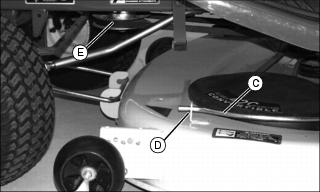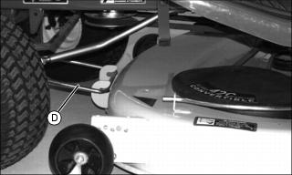 5. Lock lift lever in forward position. a. Grasp and hold tension rod (C) securely. b. Disengage rod from retaining bracket (D). c. Move rod as far as possible toward rear wheel to remove all belt tension. 7. Hold tension rod in released position. Remove mower drive belt (E) from engine drive sheave. 8. Move tension rod to latched position. 9. Pull out and push down on lever (F) to release front lift rod assembly. 10. Remove front lift rod assembly (G) from machine and mower deck. NOTE: It may be necessary to manually lift up on rear of mower deck to pull out J-pins. 11. Pull outward on J-pins (H) at both sides of mower to disconnect draft arms. 12. Put lift lever in transport position. 13. Slide mower deck out from under machine. Remove 54C mower from right side only. Installing Mower