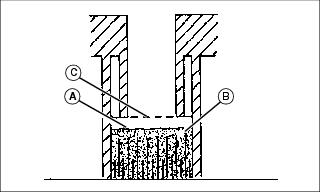 4. Check electrolyte level. Electrolyte level (A) should be 6 mm (1/4 in.) above plates (B) and below filler neck (C). 5. Add distilled water if necessary. 7. Check battery cable hardware and tighten if necessary. Removing and Installing Battery