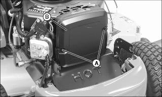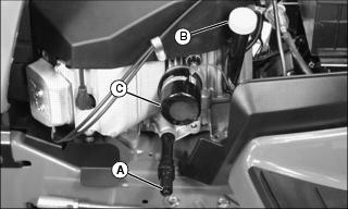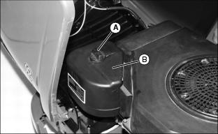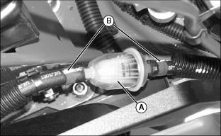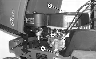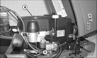 1. Park machine safely. (See Parking Safely in Safety section.) 2. Clean air intake screen (A), cooling fins, and external surfaces (B), with rag, brush, vacuum or compressed air. Servicing Air Cleaner (GT225)1. Park machine safely. (See Parking Safely in Safety section.) 4. Loosen knob (A) and remove air cleaner cover (B). 5. Inspect foam precleaner (C) without removing it. If precleaner is dirty: a. Remove precleaner carefully without removing paper element (D). b. Wash it in a solution of warm water and liquid detergent. Rinse, squeeze out excess water in a dry cloth, and allow to air dry. c. Add approximately 30 ml (1 oz) of clean engine oil to precleaner. Squeeze precleaner to distribute oil evenly. 6. Inspect paper element (D) without removing it. If element is damaged or very dirty: b. Remove paper element carefully from air cleaner housing. Discard paper element. c. Clean air cleaner housing carefully to prevent dirt from entering carburetor. d. Install new paper element into air cleaner. Make sure element is seated properly. 7. Install precleaner on paper element. 8. Install air cleaner cover. Do not overtighten. Servicing Air Cleaner (GT235)1. Park machine safely. (See Parking Safely in Safety section.) 4. Release latches (A) and remove air cleaner cover (B). 5. Inspect foam precleaner (C) without removing it. If precleaner is dirty: a. Remove precleaner carefully without removing paper element (D). b. Wash it in a solution of warm water and liquid detergent. Rinse, squeeze out excess water in a dry cloth, and allow to air dry. c. Add approximately 30 ml (1 oz) of clean engine oil to precleaner. Squeeze precleaner to distribute oil evenly. 6. Inspect paper element (D) without removing it. If element is damaged or very dirty: a. Remove knob (E) and plate (F). b. Remove paper element carefully from air cleaner housing. Discard paper element. c. Clean air cleaner housing carefully to prevent dirt from entering carburetor. d. Install new paper element into air cleaner. Make sure element is seated properly. e. Install plate and secure with knob. 7. Install precleaner on paper element. 8. Install and latch air cleaner cover. Servicing Air Cleaner (GT245)1. Park machine safely. (See Parking Safely in Safety section.) 4. Release plastic retainers (A) and remove air cleaner cover (B). 5. Inspect foam precleaner (C) without removing it. If precleaner is dirty: a. Remove precleaner carefully without removing paper element (D). b. Wash it in a solution of warm water and liquid detergent. Rinse, squeeze out excess water in a dry cloth, and allow to air dry. c. Add approximately 30 ml (1 oz) of clean engine oil to precleaner. Squeeze precleaner to distribute oil evenly. 6. Inspect paper element (D) without removing it. If element is damaged or very dirty: b. Remove paper element carefully from air cleaner housing. Discard paper element. c. Clean air cleaner housing carefully to prevent dirt from entering carburetor. d. Install new paper element into air cleaner. Make sure element is seated properly. 7. Install precleaner on paper element. 8. Install and fasten air cleaner cover using original plastic retainers. Checking Spark Plugs1. Park machine safely. (See Parking Safely in Safety section.) 4. Disconnect spark plug wire(s) (A). 6. Clean each spark plug carefully with a wire brush. · Pitted or damaged electrodes. NOTE: In Canada, replace spark plug with resistor plug only. 8. Replace spark plugs as necessary. 9. Check plug gap (B) with a wire feeler gauge. To change gap, bend outer electrode (C). · GT225 - Gap must be 1.00 mm (0.040 in.). · GT235 - Gap must be 0.75 mm (0.030 in.). · GT245 - Gap must be 0.75 mm (0.030 in.). 10. Install and tighten spark plugs: · GT235 and GT245 - 20 N·m (15 lb-ft). Adjusting CarburetorNOTE: Carburetor is calibrated by engine manufacturer and is not adjustable. If engine is operated at altitudes above 1829 m (6,000 ft), some carburetors may require a special high altitude main jet. See your John Deere dealer. If engine is hard to start or runs rough, check troubleshooting section of this manual. Possible engine surging will occur at high throttle with transmission in "N" neutral and mower engagement lever disengaged. This is a normal condition due to emission control system. If engine is still not functioning correctly after performing checks in troubleshooting section, contact your John Deere dealer. Replacing Fuel FilterNOTE: Change filter when fuel is low to prevent excessive fuel spillage. 1. Park machine safely. (See Parking Safely in Safety section.) 4. Place a drain pan under fuel filter (A). 5. Note direction of arrow on fuel filter so new filter can be installed in same direction. 6. Use a pliers to slide hose clamps (B) away from fuel filter. 7. Disconnect hoses from filter.