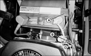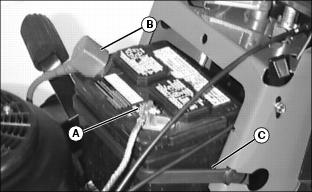 4. Push red cover (B) away from positive (+) battery cable and remove cable from battery.