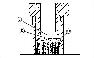 4. Check electrolyte level. Electrolyte level (B) should be 6 mm (1/4 in.) above plates (C) and below filler neck (D).