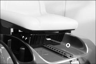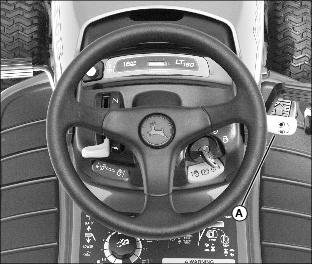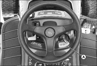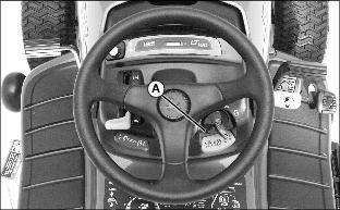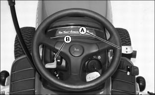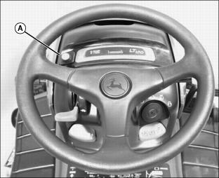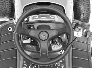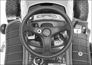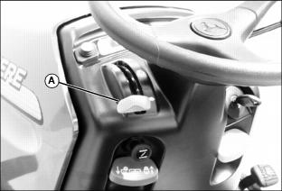 3. Push and hold in the reverse implement button (A) while depressing reverse foot pedal.